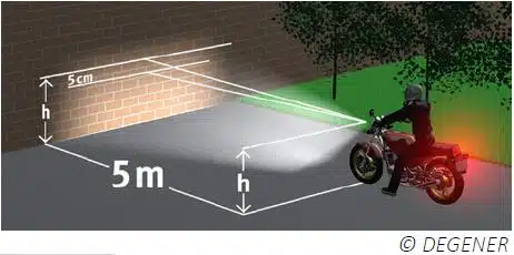 Für Motorradfahrer gibt es übrigens eine ganz ähnliche Möglichkeit zur Überprüfung der Scheinwerfer-Einstellung, indem Sie sich ca. 5 m vor einer Hauswand gerade auf die Maschine setzen: „Der Abstand zwischen Wand und Scheinwerfer beträgt 5 Meter. Die Höhe vom Boden bis zur Scheinwerfermitte (h) wird auf die Wand übertragen. Die Hell-Dunkel-Grenze des eingeschalteten Abblendlichts muss sich 5 Zentimeter unter dieser Markierung befinden.“ (SCAN & TEACH® – DEGENER)