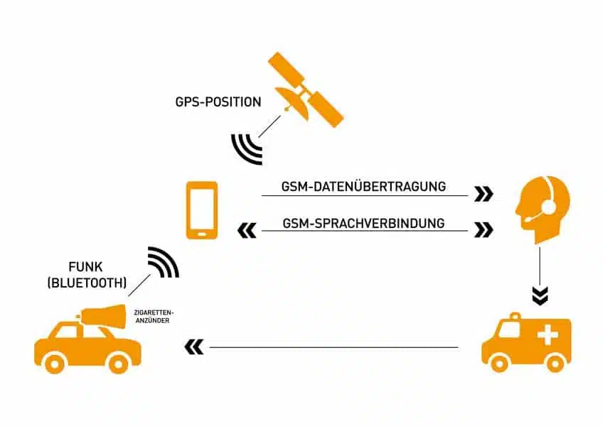 Wer den Aussagen zum Datenschutz traut und nicht darauf warten will, bis das eingebaute eCall-Notrufsystem zur Standard-Fahrzeug-Ausstattung geworden ist, kann alternativ bei vielen Versicherern unter der Bezeichnung „Unfallmeldedienst“ (UMD) eine Nachrüstlösung* für praktisch jedes Fahrzeug erhalten. Sie besteht aus einem Unfallmeldestecker für den Zigarettenanzünder (12 Volt-Buchse) und einer Smartphone-App. Einmal installiert, funktioniert es ganz ähnlich wie das fest eingebaute System: Sensoren im Unfallmeldestecker erkennen eine Kollision und ihre Aufprallstärke, die Informationen werden über Bluetooth an das Smartphone des Fahrers gesendet, die Unfallmelde-App ruft automatisch die Notrufzentrale an, das Unfallopfer kann direkt mit einem Notrufagenten sprechen. Gleichzeitig erhält der Agent die von der Unfallmelde-App übersendeten Positionsdaten des Unfallfahrzeugs und die letzte Fahrtrichtung. Nach persönlicher Klärung der Sachlage gibt die Notrufzentrale der Autoversicherer alle für eine schnelle Hilfe notwendigen Informationen umgehend an die Rettungsleitstelle weiter, damit diese dem Unfallopfer schnelle Hilfe leisten kann. (Quelle: www.unfallmeldedienst.de)