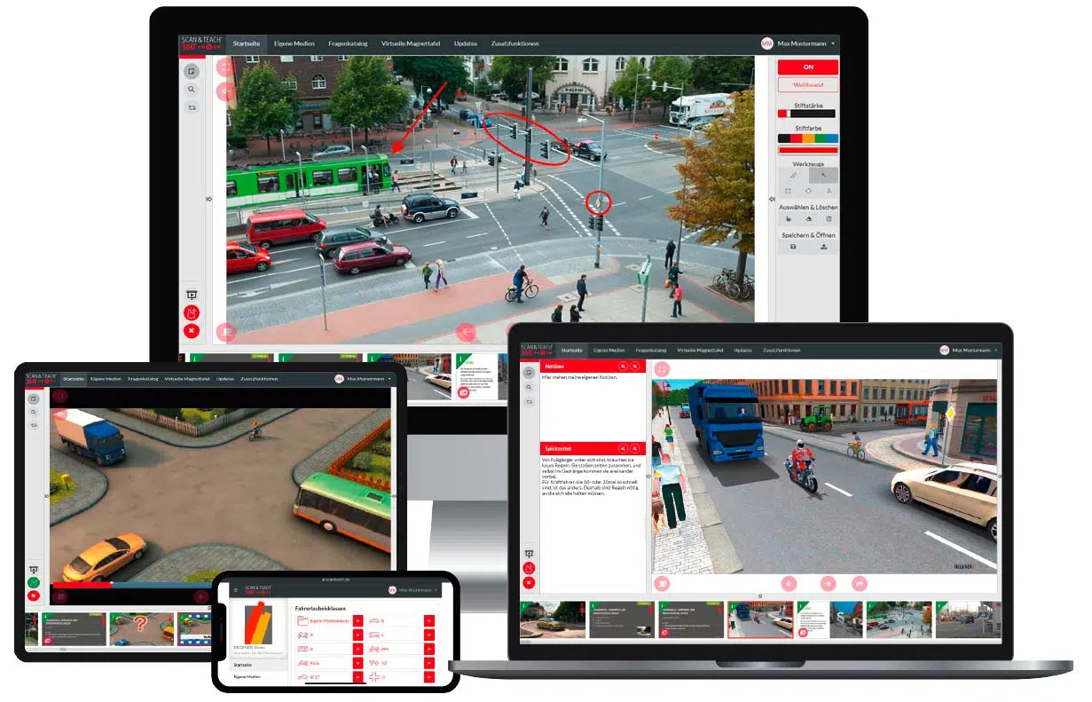 Kein Wunder, dass der DEGENER Verlag mit seiner cloudbasierten SCAN & TEACH® Unterrichtssoftware für Fahrschulen erneut einen nachahmenswerten Trend gesetzt hat: Für den innovativen Impulsgeber der Fahrschulbranche steht die Entwicklung und Optimierung der Unterrichtssoftware an erster Stelle. Wettbewerb ist für das traditionsreiche Familienunternehmen, das sich in 88 Jahren als kompetenter Partner der Fahrschulen und Fahrlehrerausbildungsstätten profiliert hat, nur zusätzlicher Ansporn. Eigene Entwicklungen, starke Partner und neueste Technologien gehören zu den Markenzeichen des Trendsetters. Das Zusammenspiel der großformatigen Smart-Displays und einer flexibel anpassbaren Verwaltungssoftware mit der ersten cloud-basierten, plattformunabhängigen Unterrichtssoftware SCAN & TEACH 360° RED begeistert schon seit Jahren auf allen Systemen, vom PC über Smartphone, Tablet oder Linux bis zum MAC.