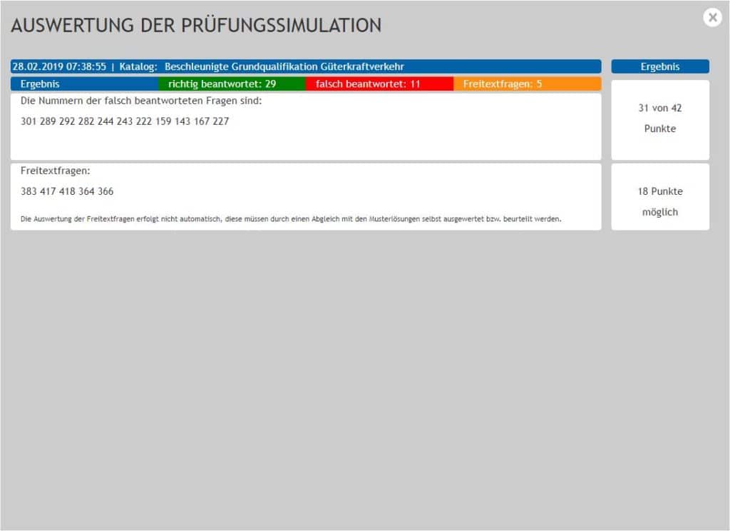 - Zufallsfragen: In diesem Feature kann der Schüler zufällig ausgewählte Fragen trainieren. Die Anzahl der Fragen kann er dabei im Vorfeld festlegen. Dies stellt eine Trainingsrunde vor der Prüfungssimulation dar.