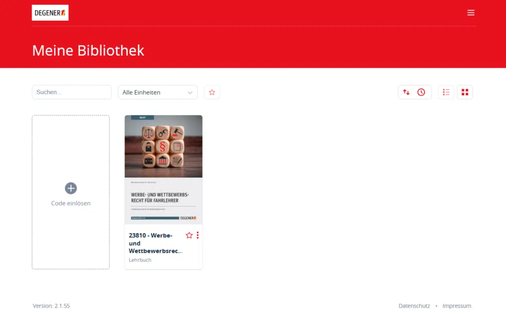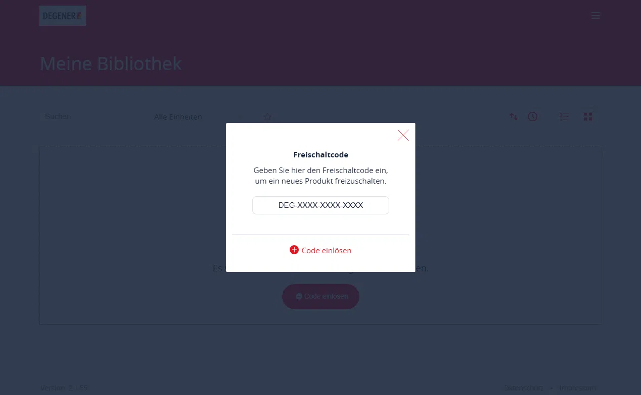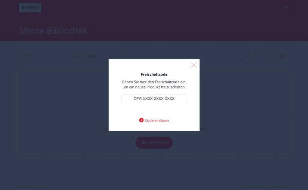 Nachdem Sie im DEGENER Onlineshop eines unserer Bücher als E-Book (digitale Version) erworben haben, erhalten Sie per E-Mail in Ihrer Bestellbestätigung einen Lizenzschlüssel übermittelt. Um diesen Lizenzschlüssel / Code einzulösen, gehen Sie bitte folgendermaßen vor: