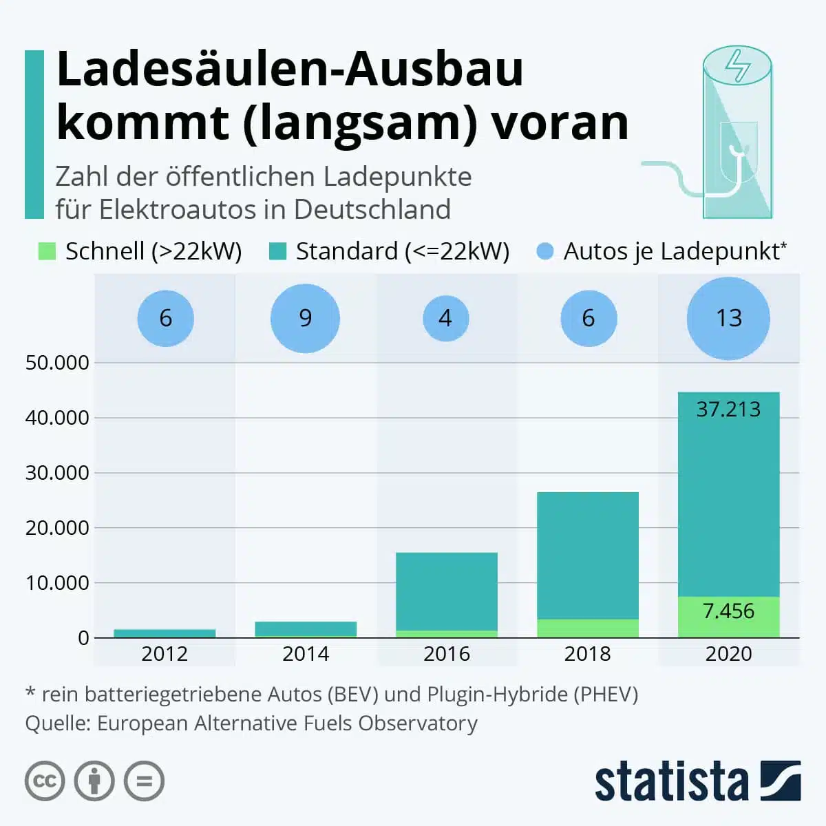 Nach anfänglich eher schleppenden Verkaufszahlen hält inzwischen der Ausbau von Schnell- und Standard-Ladepunkten für elektrisch angetriebene Autos in Deutschland nicht Schritt mit den steigenden Neuzulassungen. Das zeigt die Statista-Grafik auf Basis von Daten der European Alternative Fuels Observatory. Kamen 2018 noch sechs E-Autos auf einen Ladepunkt, sind es 2020 mittlerweile 13 Autos je Ladepunkt. Grund für die Entwicklung sind die zahlenmäßig stark gestiegenen Neuzulassungen von Elektroautos in Deutschland. Laut Kraftfahrt-Bundesamt (KBA) gab es im vergangenen Jahr 446.756 Neuzulassungen von Pkw mit Hybrid-Antrieb – das sind fast 208.000 Fahrzeuge mehr als im Vorjahr. Ein Grund für den positiven Trend bei den Zulassungen alternativer Antriebe dürften die Kaufprämien sein, die von Bund und den Herstellern derzeit gewährt werden.