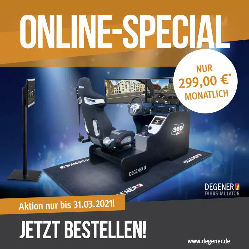 Sie kennen das, wenn Fahrschüler (m, w, d) im Prüfungsstress den Motor abwürgen und immer nervöser werden. Ohne Not. Weil die Routine nicht sitzt und das Anfahren plötzlich zur Denkarbeit wird – statt einfach ein oft geübter Handlungsablauf zu bleiben. Wir helfen Ihnen bei der besonders effizienten Schulung ihrer Schützlinge – selbstverständlich unter strengster Einhaltung der Hygieneregeln. Jetzt ist genau der richtige Moment, den DEGENER Fahrsimulator 360° simdrive 2.0 in Ihr Fahrschul-Konzept mit aufzunehmen: Er nimmt sich gelassen der unsicheren Fahranfänger an und weist sie selbstständig und zielorientiert in die Grundlagen des Autofahrens ein. Er entlastet Ihr Team, schont nicht nur die Nerven der Lehrenden, sondern auch Kupplung, Bremsen und Schalthebel der Fahrzeuge – und ist ganz nebenbei ein ausgezeichnetes Werbeargument, das Ihrem Unternehmen auf allen Ebenen Ihrer Öffentlichkeitsarbeit besonderen Glanz verleiht!