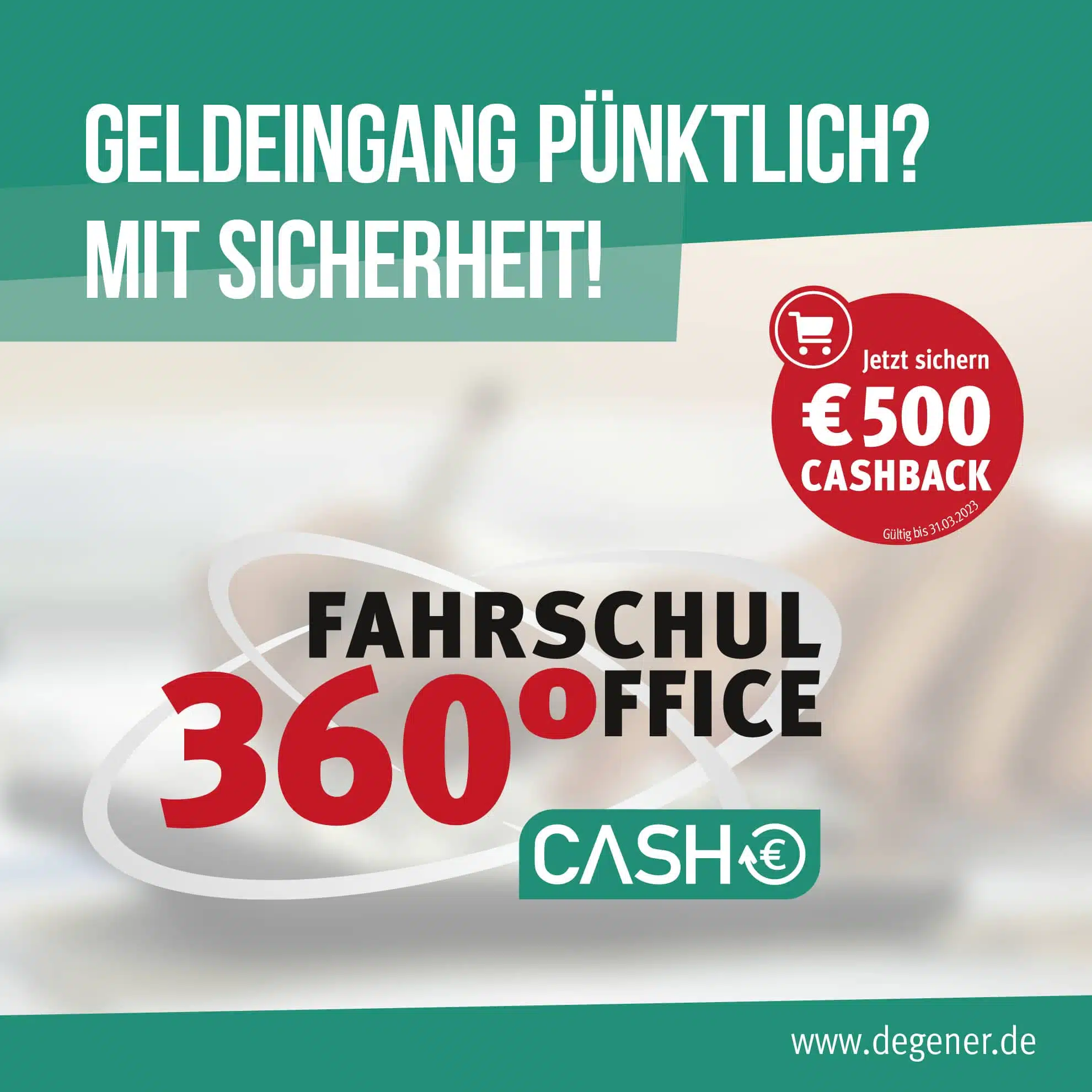 Mit dem DEGENER-Partner FAHRSCHULOFFICE 360°-CASH machen Sie sich und Ihren Kunden das Leben leichter. Sie kümmern sich um den Unterricht – Ihre Kunden kümmern sich um die Bezahlung: Sollte der Geldfluss irgendwann einmal ein bisschen ins Stocken geraten, muss das nicht zu Lasten der Ausbildungsarbeit gehen – Ihre Zahlungseingänge bleiben gesichert!