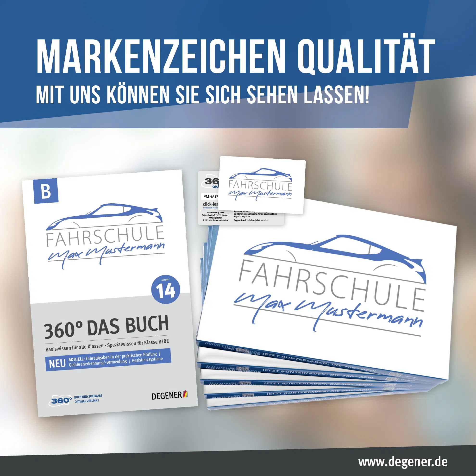 Gerade das Buch bietet dabei mit Vorder- und Rückseite besonders viel Werbefläche: Sprechen Sie uns an! Mit uns platzieren Sie Ihr Markenzeichen, Ihre Fahrzeuge, Ihr Unternehmensselbstbild professionell und lassen das Buch und Ihr Unternehmen gut aussehen. Auf Wunsch liefert DEGENER eine individuelle Gestaltung unter Einbeziehung von Firmenlogo und vorgegebenem Corporate Design. Sie behalten die Fäden in der Hand: Senden Sie uns Ihre Gestaltungsvorlage per E-Mail, wir setzen Ihren Entwurf professionell um und schicken Ihnen einen Korrekturabzug als PDF. Die Einzelheiten vereinbaren Sie mit Ihrem DEGENER Fahrschul-Fachberater. – Mit uns können Sie sich sehen lassen!