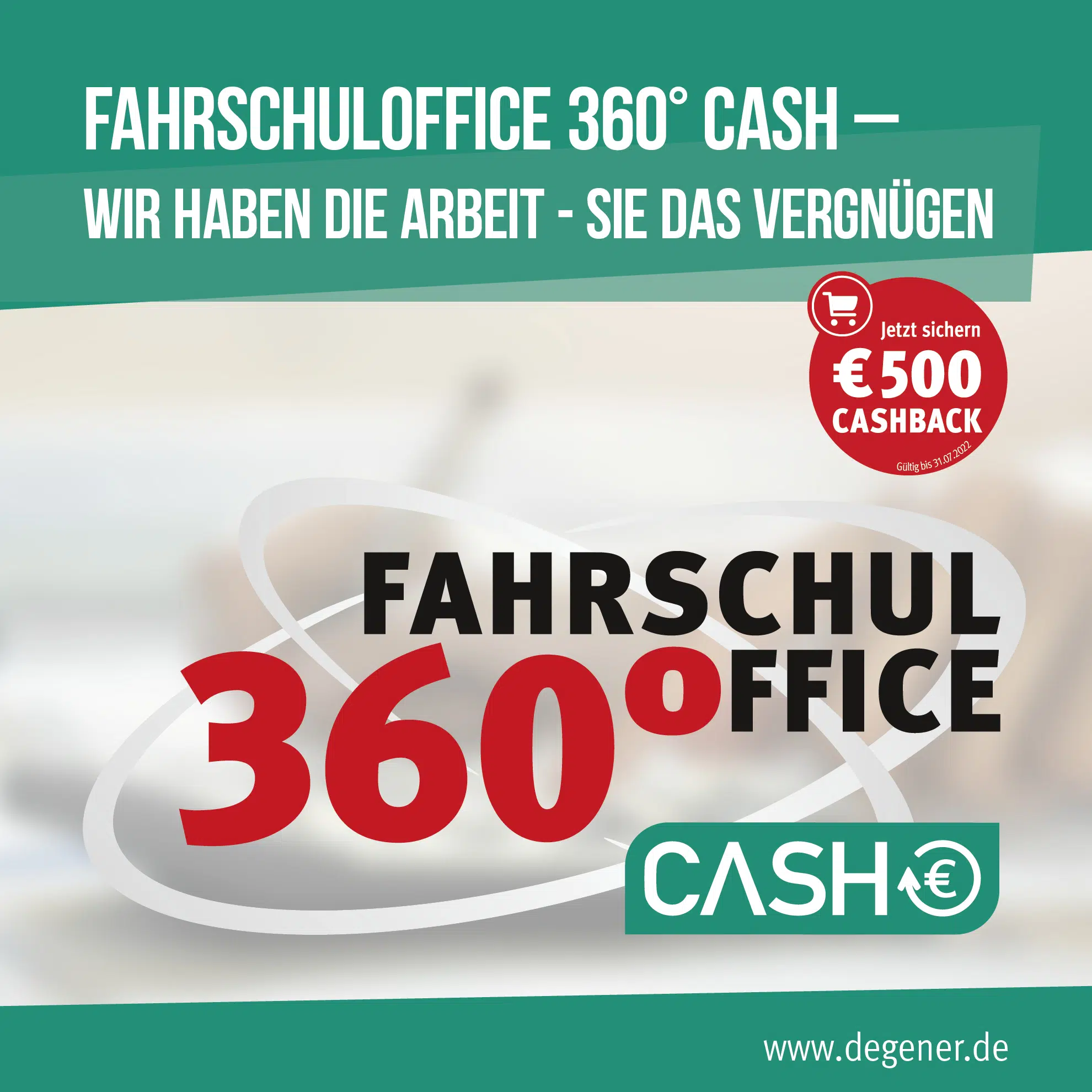 Nicht nur für Dienstleister wie Fahrschulunternehmen kann der Spagat zwischen der kundennahen Ausbildung und der unerfreulichen Auseinandersetzung mit Zahlungssäumigen zur persönlichen Belastung werden. Vergeuden Sie Ihre wertvolle Zeit nicht mit dem Nachfassen und Einsammeln von Außenständen. Besser ist es doch, das Geld folgt sicher auf die Leistung – und noch dazu mit Garantie! Lassen Sie einfach professionelle Partner dafür sorgen, dass sich die Rechnungen, die Sie ausstellen, auch bezahlt machen. FSO360° CA$H hält Ihnen nicht nur den Ärger über unbezahlte Rechnungen fern, Sie vermeiden auch unnötige Störungen des Vertrauensverhältnisses zu Ihren Kunden. Nach dem erfolgreichen Start des Systems ist der DEGENER Verlag inzwischen so überzeugt von der Effizienz und Qualität des Produkts, dass wir Ihnen jetzt für kurze Zeit sogar € 500 CASHBACK anbieten!