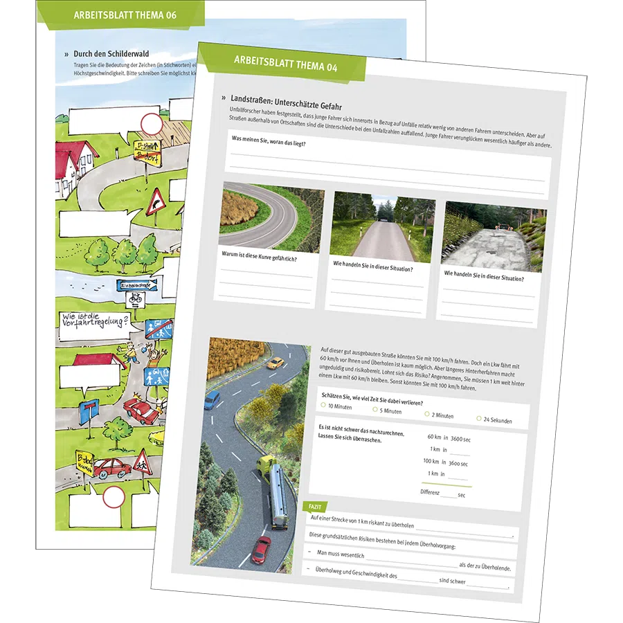 Eine Methodik, die im Zuge der neuen Fahrlehrerausbildung wieder an Bedeutung gewinnt: Beziehen Sie Ihre Schüler aktiv in den Unterricht ein. Fernab der Fragebogen-Optik und ohne den Verdacht auf bloße Prüfungsvorbereitung wecken diese Arbeitsblätter das Interesse an der Beschäftigung mit theoretischen Fragen zu Fahrerlaubnis- und Straßenverkehrsrecht.