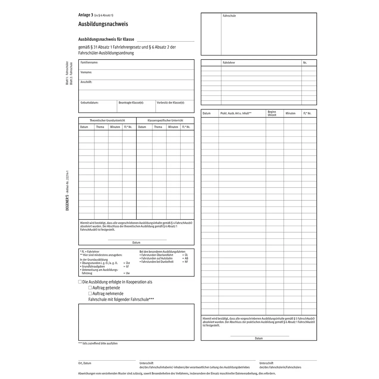 Ob Theorie- oder Praxisausbildung: Die Bestätigungen, dass die jeweils vorgeschriebenen Ausbildungsinhalte absolviert wurden bzw. der Abschluss der Ausbildung fest gestellt ist, befinden sich jetzt nebeneinander auf einem Blatt. Alte, bereits begonnene Formulare behalten noch für zwei Jahre ihre Gültigkeit. Gemäß Änderung der Durchführungsverordnung zum Fahrlehrergesetz (FahrlG-DV) ist ab 01.01.2020 zwingend der neue Ausbildungsnachweis gemäß Anlage 3 FahrlG-DV zu verwenden.