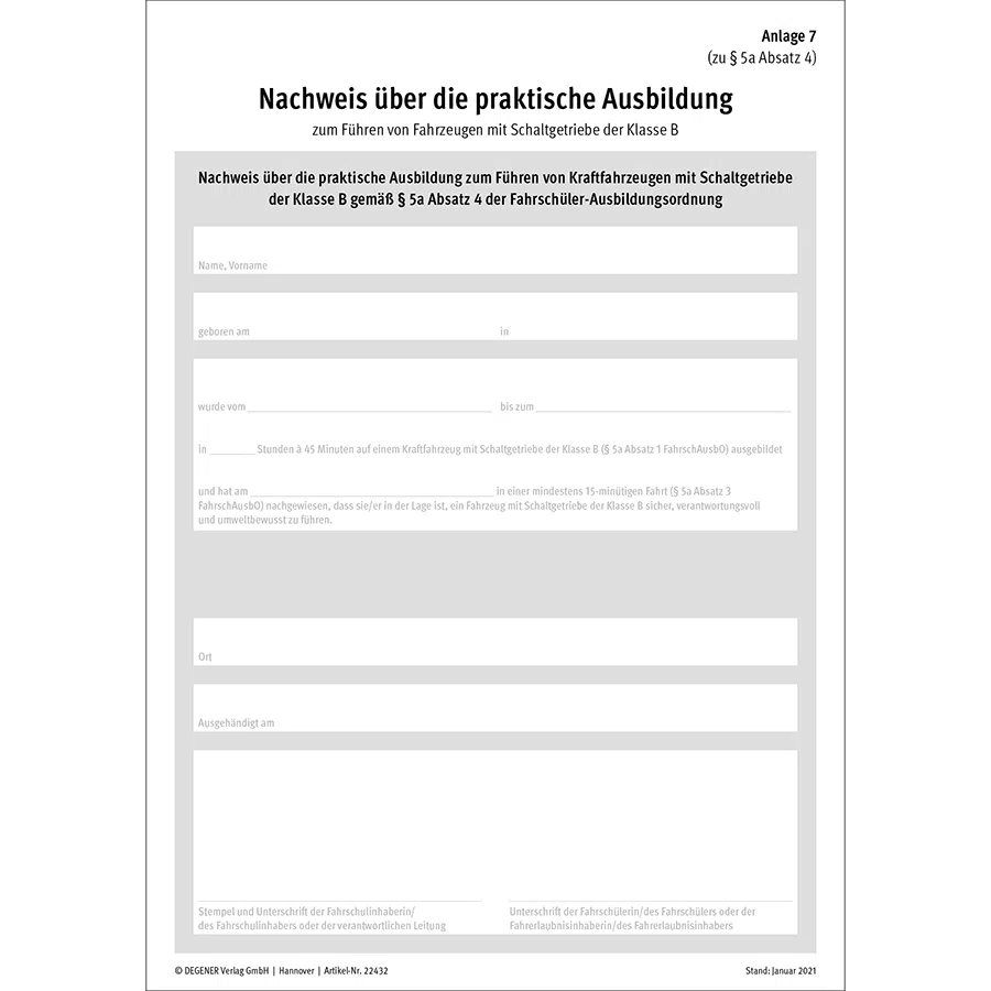 Nutzen Sie dieses Formular, um Ihren Fahrschülern den Nachweis über die praktische Ausbildung zum Führen von Kraftfahrzeugen mit Schaltgetriebe der Klasse B gemäß § 5a Absatz 4 der Fahrschüler-Ausbildungsordnung zu erteilen.