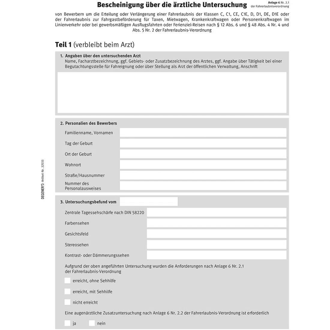 Bescheinigung über die ärztliche Untersuchung nach Anlage 6, Nr. 2.1, DIN-A4, 2-fach, Packungseinheit mit 25 Stück