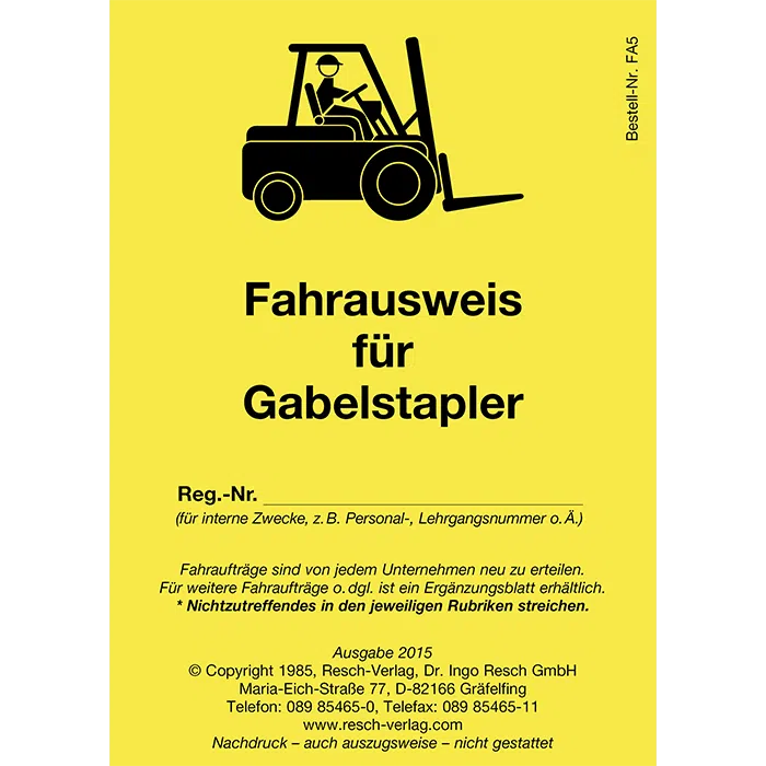 Zur Dokumentation der Eignung/Tauglichkeit, Aus-, Fort- und Zusatzausbildungen, der jährlichen Unterweisung(en) und der Erteilung des schriftlichen Fahrauftrages gemäß DGUV G 308-001 bzw.entsprechenden berufsgenossenschaftlichen Vorschriften u. dgl. Unempfindliches Spezialpapier, faltbar auf Führerscheingröße.