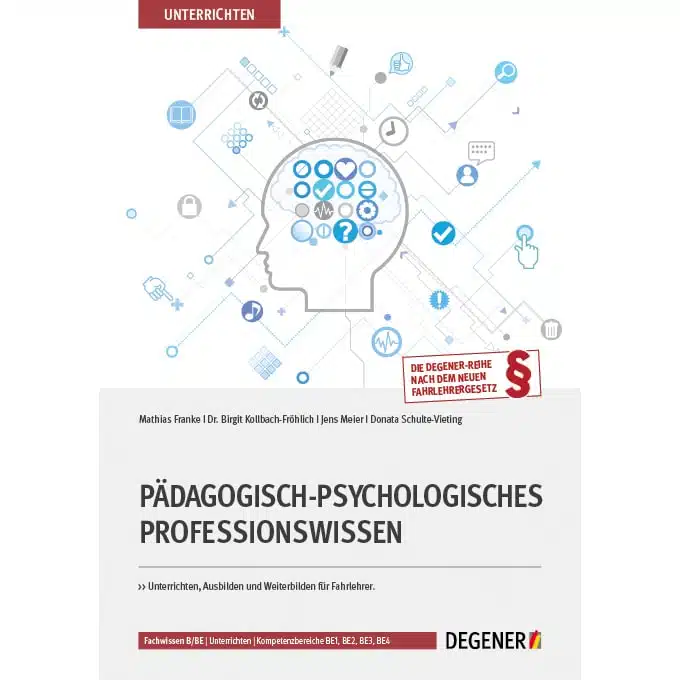 Der Band „Pädagogisch-psychologisches Professionswissen“ aus der DEGENER Fahrlehrer-Bibliothek umfasst die Grundlagen der Fahranfängervorbereitung, die Gestaltung des Theoretischen und Praktischen Unterrichts und weitere Tätigkeitsfelder des Fahrlehrerberufs. Weiterhin deckt er als Teil der DEGENER-Fachbuchreihe für die neue Fahrlehrerausbildung in Deutschland den Kompetenzbereich Unterrichten, Ausbilden und Weiterbilden ab.