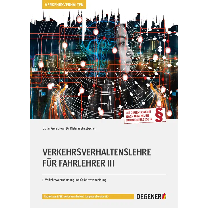 Wie nehmen Menschen – insbesondere als Fahranfänger – den Straßenverkehr wahr? Und wie sind potentielle Gefahren frühzeitig zu erkennen? Der kompetente Fahrer „liest den Straßenverkehr“, sieht Entwicklungen vorher und beugt so dem Entstehen gefährlicher Situationen vor. Der Verkehrsverhaltenslehre für Fahrlehrer III Band „Verkehrswahrnehmung und Gefahrenvermeidung“ der DEGENER-Fachbuchreihe für die neue Fahrlehrerausbildung in Deutschland bietet angehenden Fahrlehrerinnen und Fahrlehrern einen umfassenden und leicht verständlichen Einblick in die menschlichen Wahrnehmungsprozesse im Straßenverkehr.