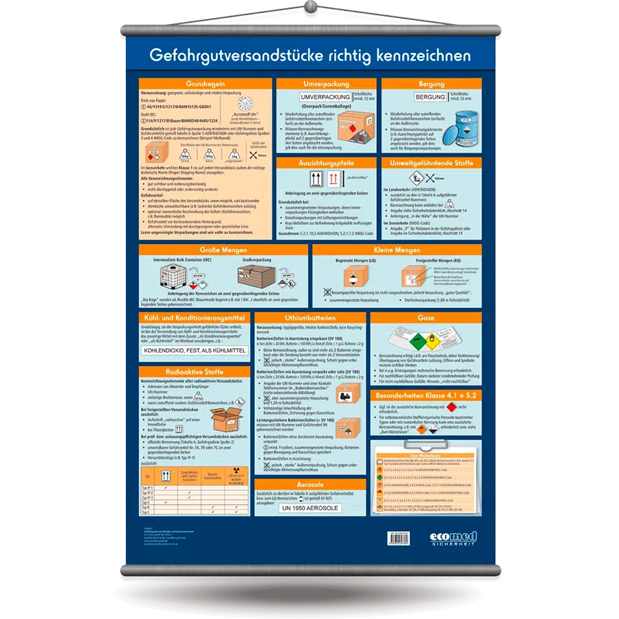 Auf der Wandtafel Gefahrgutversandstücke sicher kennzeichnen finden Sie die verschiedenen Anforderungen an die Kennzeichnung übersichtlich und gut bebildert dargestellt. Die Wandtafel dient dem Verpacker als konkrete Gedankenstütze in der Praxis. Sie ist auch gut als Hilfsmittel für Schulungen und Unterweisungen geeignet.