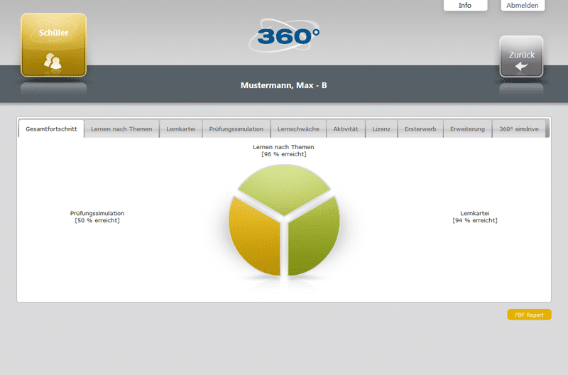 - Immer auf dem neuesten Stand: Sie wissen immer wie weit Ihre Schüler sind und ob sie bereits prüfungsreif sind