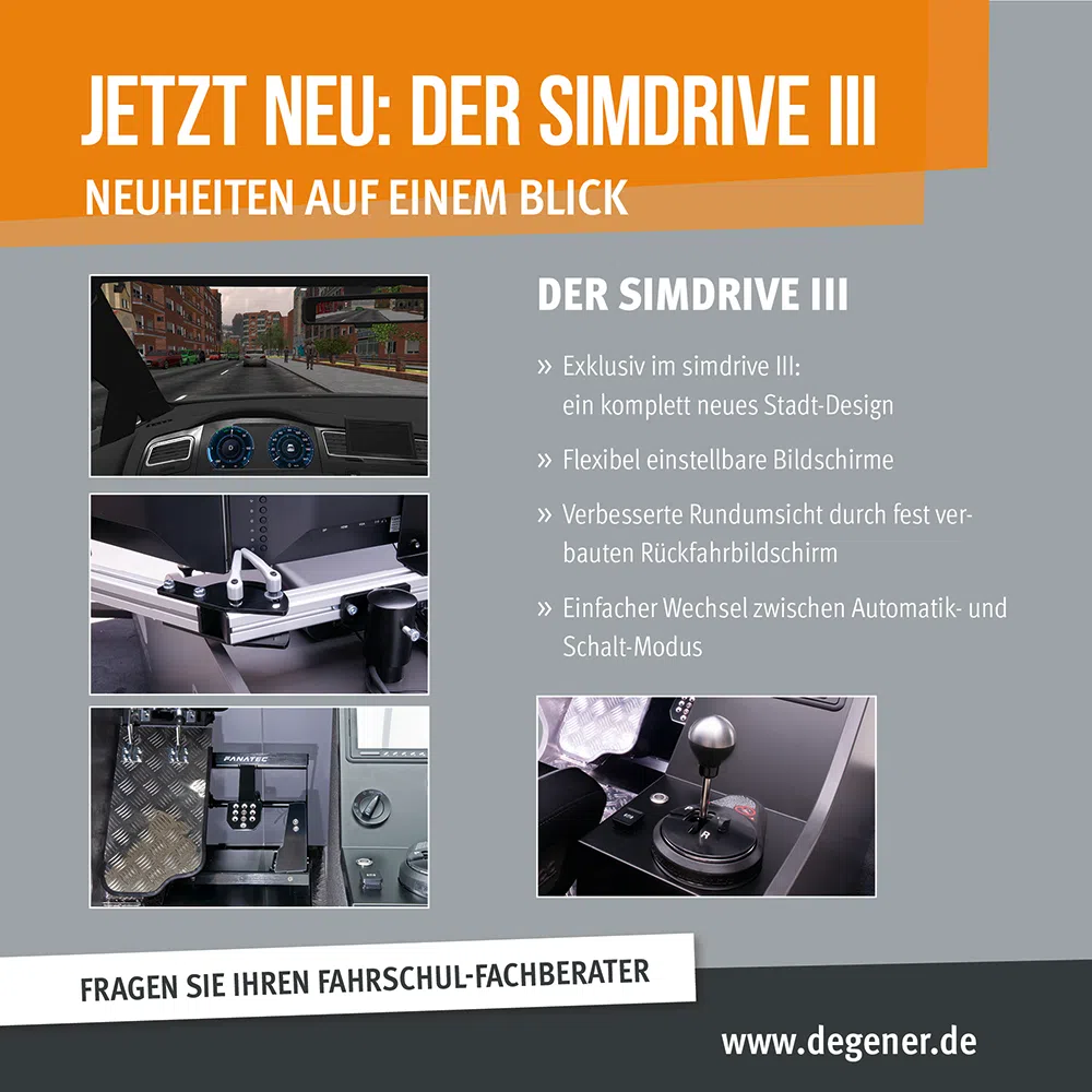 Dreipunktgurt, einstellbarer Sportsitz und das Körperschallmodul sind auch im DEGENER SIMDRIVE III die bewährten konstruktiven Bestandteile des Systems, die dem Schüler das Gefühl einer realistischen, ernsthaften Ausbildung vermitteln. Durch einfache Umstellungen ist derselbe SIMDRIVE III gleich für mehrere Bereiche einsatzbereit. Sei es als Trainer für die Schaltvorgänge mit einer modernen Sechs-Gang-Handschaltung oder zur Vorbereitung auf das Fahren mit einem Automatik- oder Elektro-Fahrzeug (mittels digitaler Programmauswahl und einer einfachen analogen Schablone für die Schaltkulisse). Der leistungsfähige Simulator trainiert die nötigen Bewegungsabläufe und ihre Koordination für die Fahrzeugbedienung in den verschiedenen Modulen Grundfertigkeiten (Einsteigen, Lenken), Abbiegen (Einfahren auf die Straße, Nach rechts und links abbiegen), Vorfahrt (Wer fährt zuerst, Wer knickt hier ab) und Stadtfahrt (gemischt, „Fast wie im richtigen Leben“). Nur das Modul „FAHRLEHRER“ ist für den Fahrschüler nicht selbstständig zu bearbeiten: Hier bestimmt der Fahrlehrer begleitend die Fahrsituation (Fahren, Abbiegen, Einparken) und kann z. B. mithilfe des Perspektiven-Wechsels (z. B. „Draufsicht“) die Situationen leichter erklären.