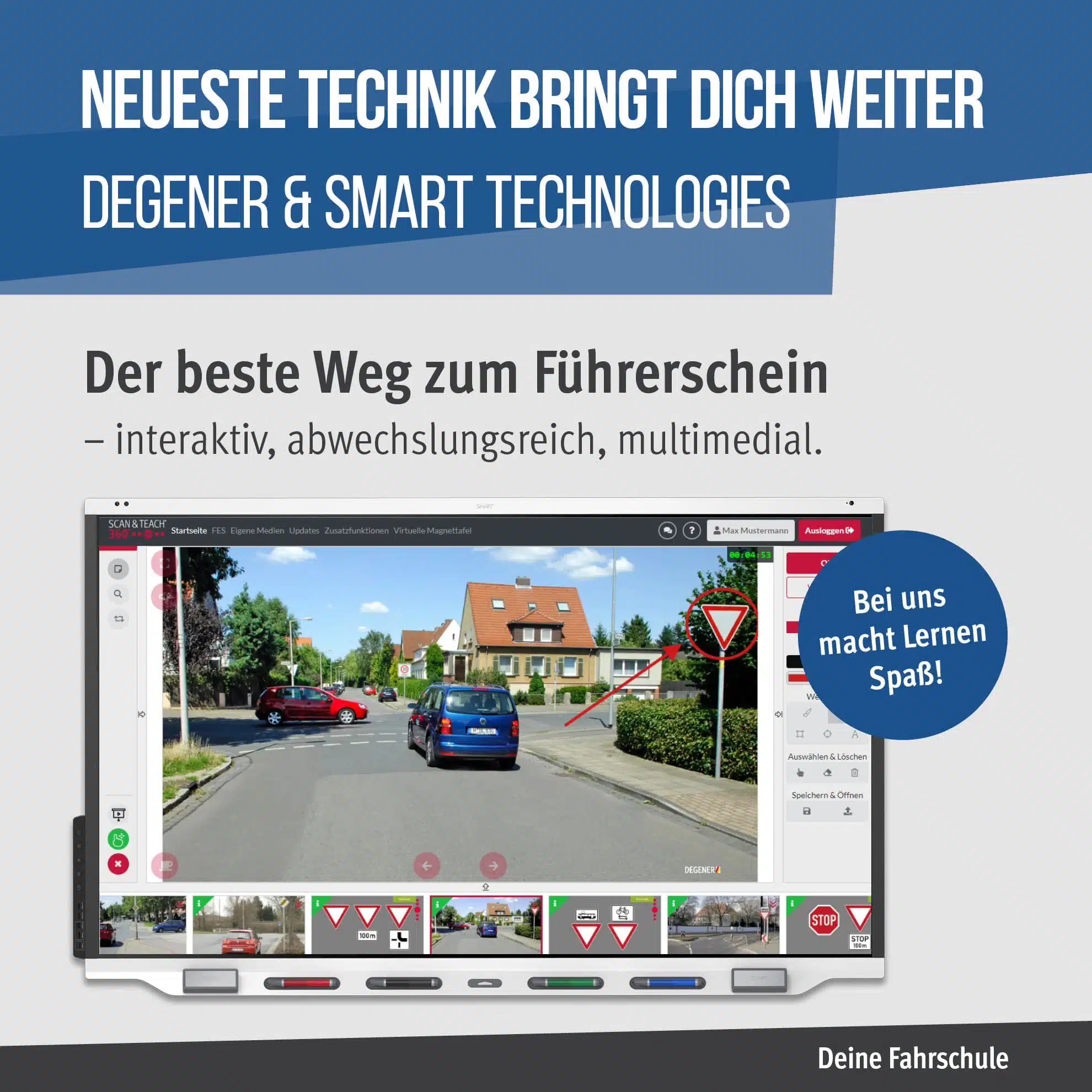 Zusammen mit SCAN & TEACH® 360° RED bietet das Board einfach alles für einen anspruchsvollen Fahrschulunterricht und setzt in Sachen Strukturierung der Unterrichtseinheiten, Motivierung der Fahrschüler, Visualisierung der Lehr-Lerninhalte, Qualität der Lehrvorträge, Organisation von Diskussionen und die Durchführung von Lernkontrollen etc. Maßstäbe. Wer mit einem modernen SMART-Board unterrichtet, hat nicht nur mehr Freude am Lehren, sondern erfüllt spielend leicht die Qualitätskriterien für die Beurteilung Ihres Unterrichts in der pädagogischen Fahrschulüberwachung (PQFÜ).