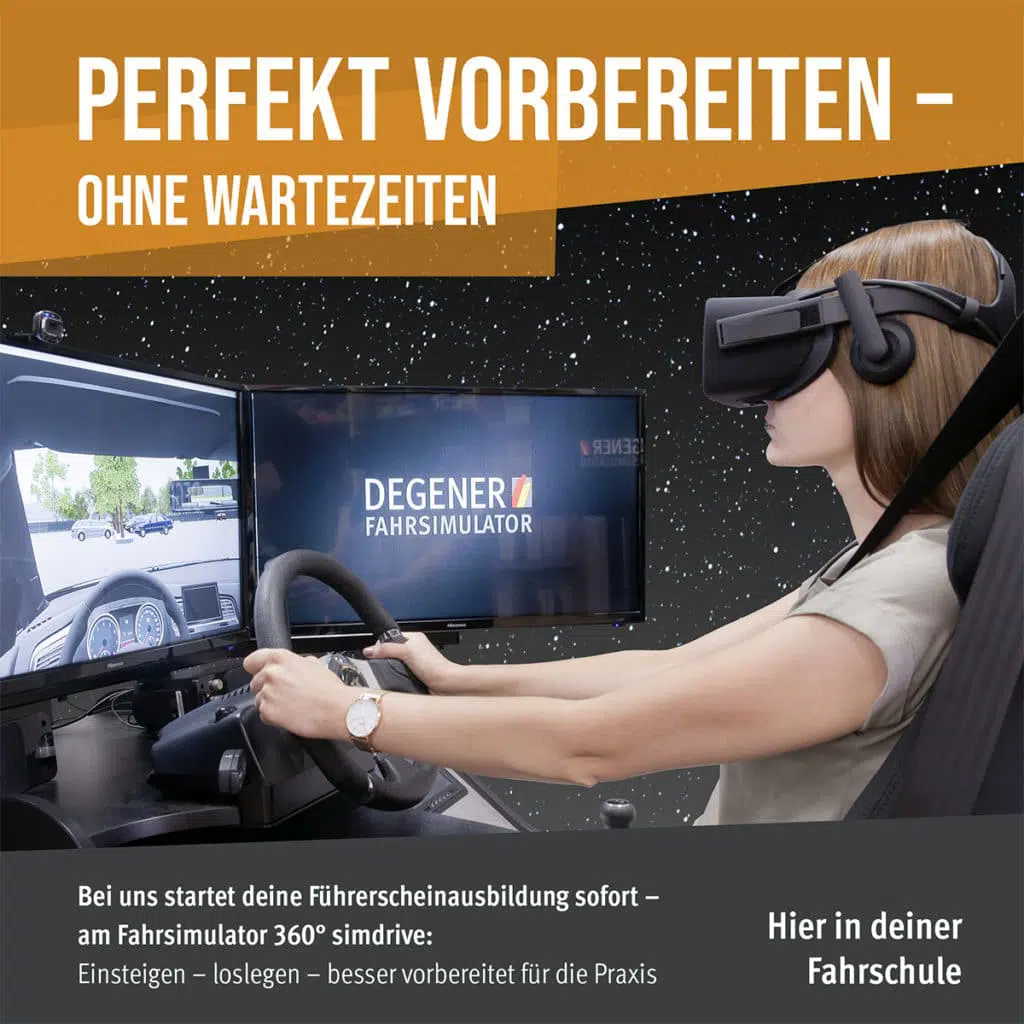 Wer möglichst allen Anfragen auf optimale Weise gerecht werden will ohne seinen Kunden unnötige Wartezeiten zuzumuten, für den ist der DEGENER Fahrsimulator 360° simdrive 2.0 eine optimale Ergänzung zum Fahrlehrerteam. Der virtuelle Fahrlehrer ist ein geduldiger und belastbarer Mitarbeiter. Er nimmt sich ohne Rücksicht auf Arbeitszeitvorgaben der Fahranfänger an und weist sie selbstständig in die „Geheimnisse“ des Autofahrens ein. Er arbeitet auch an den Tagen, an denen sonst keine praktischer Unterricht stattfindet und nur das Büro geöffnet ist. In aller Ruhe nimmt der 360° simdrive 2.0 Ihren Schülern die Angst und hilft gelassen beim Erlernen der Grundfertigkeiten, dem grundsätzlichen Vorgehen beim Abbiegen und der Vorfahrt sowie den Grundzügen einer Stadtfahrt. Ihre Schüler lernen das Fahren quasi selbstständig. Dazu stehen 4 Module mit je 2 x 45 Minuten Lerneinheiten zur Verfügung, die zusammen mindestens 8 Simulator-Stunden für jeden Schüler ergeben.